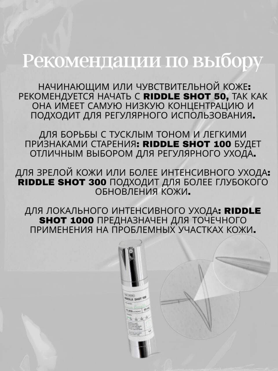 ✨ Описание продукта Riddle Shot 100 — это легкая и эффективная сыворотка, которая увлажняет, восстанавливает и делает кожу сияющей. Сыворотка помогает бороться с первыми признаками усталости и старения, выравнивает тон кожи и повышает её упругость. 💧 Для какого типа кожи Подходит для: